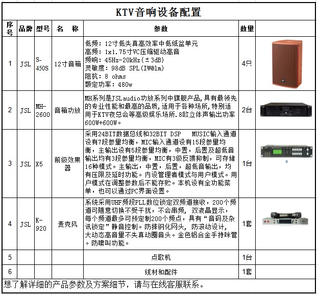 介绍一套高档KTV音响套装,由4只十二寸音箱S-450S、功放、效果器、无线话筒、点歌机组成,适用于40-60平包房,商用家用两相宜。