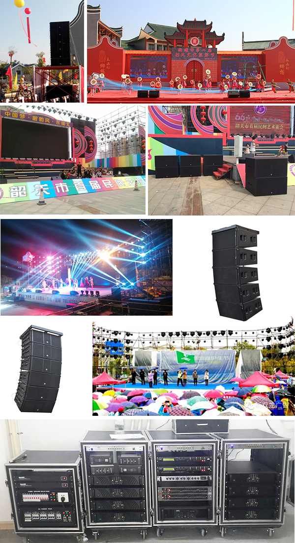 室内小型演出,一般配置两只单十五的音箱加周边设备即可;若是中型演出,则要根据具体场地大小配置双十五寸舞台音箱,及相应功率的功率放大器和周边设备;若是室外大型演出,则要考虑用线阵音箱,线阵音响系统有2+1,4+2,6+2,8+4等单边组合,具体要根据场地的大小及参与人数来配置要两串还是四串组合。