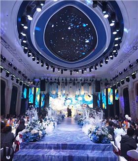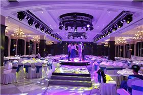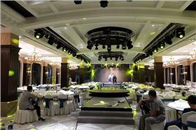 极悦娱乐工程师根据宴会厅堂的面积大小、功能的需求选择LAB608线阵音响系统进行扩声。此外,根据宴会厅的功能需求适当增加了数字音频处理器、均衡器、效果器、话筒等周边设备,为婚礼现场带来震撼音效。