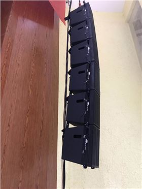 由于该校多功能报告厅结构的特殊性,为了声场更均匀,主扩声采用极悦娱乐专业线阵列音响K系列产品,搭配TC系列作为辅助音箱,保证报告厅全场高保真的扩声要求,配以高品质的话筒,呈现的效果得到政府的一致好评。