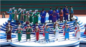 上午8点30分,伴随着悠扬的长调,由120匹红马、白马、黑马组成的马队方阵在锡林郭勒市体育中心的跑道上奔驰而过。以鲜明、华丽的形式,展现了锡林郭勒作为中国马都的地位和杰出的马文化资源,由此拉开了本次盛会的序幕。【大型演出音响】