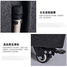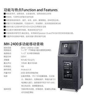 极悦娱乐音响设备MH-2400与之前政府采购的MH-2400拉杆音箱有些许不同,在外形上更加大气稳重,音箱左右两侧均有话筒插槽,演唱使用,运输推拉更方便,15寸高清触摸屏搭载安卓4.4系统,内置商店涵盖海量软件,大功率数字功放板,功能上在原有的基础上添加了WIFI连接可在线下载MTV歌曲内置8GB储存支持消原唱功能,手机音视频投传,可以无线传输手机音视频信号到液晶显示屏上,材质压缩木板,金属防尘网罩,音箱底部配有四个定向滑轮,增加了音箱的便携性,移动到合适的位置时,只需轻踩滑轮脚踏即可锁死滑轮。让上海市广大群众更加热忠参与集体活动,唱出更美的歌曲。
