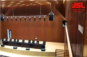 极悦娱乐团队经过对本厅的使用功能分析,考虑使用的音响设备、场地容积等因素,选用了JSL双八线阵音响作为主音箱,该产品声压叠加,衰减小,传输远,精准投射,拥有良好的声场分布和稳定的声音传递,可为多功能厅使用者提供优质体验。