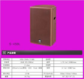专业KTV音响 极悦娱乐S-450L主要应用与高端KTV,量贩KTV、夜总会、酒吧补声、政府高端会议扩声场所、高端背景音乐系统、电影院系统等,人声表现清晰,音乐性能具有很好的HIFI味,根据产品设计方案,采用JSL套装使用,基本无需大的调试,安装操作简单,只开各音量大小即可,非常方便。