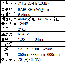 紧凑型两路分频系列,多用途箱体设计,宽广的覆盖角度,1.35VC压缩驱动高音,多悬挂点容易吊装,可调整水平与垂直覆盖角度,12寸低失真高效率中低纸盆单元。