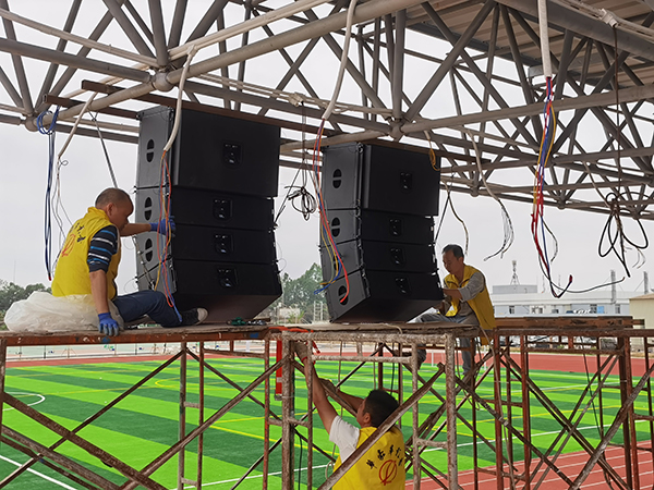 茂名市第一职业技术学校体育场在扩声系统配置过程中采用极悦娱乐户外线阵音箱系统、中远程全天候防水音箱、配套产品包括超低音音箱、专业功放、无线话筒、处理器、调音台等产品。