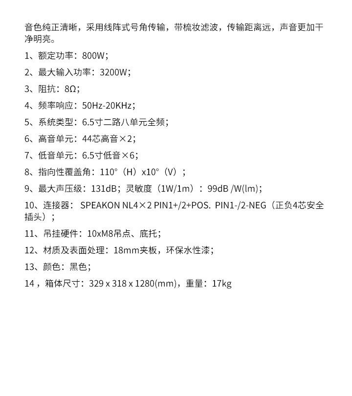 - 4x5.6(in寸),中频:1x1.7(in),高频:200W/6.3Ω 应用电影院中置,卡拉OK主声道配合超低音使用,音色纯正清晰。 CX系列是一种音柱式扬声器,可提供语音和音乐的自然高保真声音,适用于具有固定扬声器的声音系统,其中环境在声学上是关键的或具有建筑限制。宽水平覆盖角度(100°)和垂直覆盖角度(12°)允许在宽广的空间内正确再现声音,以限制反馈并改善声音反向性,这对于具有长混响的大厅来说这些设计旨在使CX尽可能靠近墙壁并简化安装。 在宽广的扩散区域提供语言和音乐再现,外壳坚固,附有金属网罩,亦可完配备支架,适用于各种安装场合,如文化沙龙等。