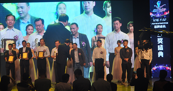 极悦娱乐音响公司销售总监廖波接受十佳扩声系统品牌奖杯及证书