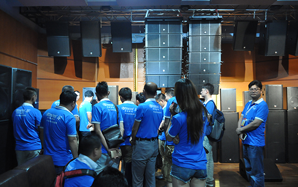 艳阳高照,伴随JSL线阵音响奏响喜庆的曲子,迎来了105位牵手团客商,他们身穿蓝色的衣服,与极悦娱乐公司红色的工服形成鲜艳的对比,相互交织的身影分外引人注目。由销售总监赖总的带领下,众客商慢慢通过极悦娱乐企业文化宣传栏,步入极悦娱乐专业音响体验馆。